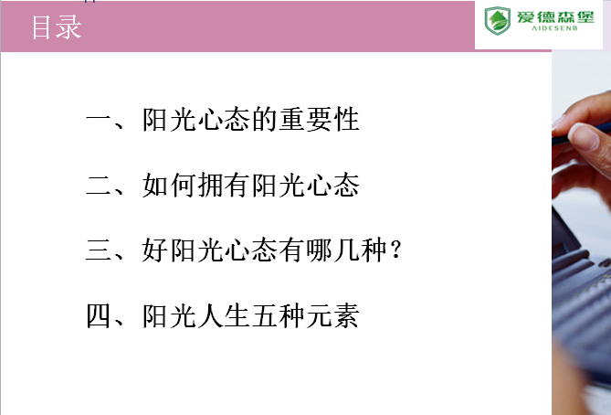 在物欲橫流、人心浮躁的當下;年輕人受挫一次,可加深對生活理解;失誤一次,將上升對人生領悟;坎坷一回,將增進對人生認識;磨難一次,將覺悟對成功真諦體會。陽光心態是一種積極、寬容、感恩、樂觀和自信的心智模式;具有陽光心態的人做事負責、樂觀開朗、自信堅強、懂得感恩、關愛他人、善于交往。21世紀新生代弄潮兒們在困難和挫折面前,該如何客觀看待世界,積極健康擁抱工作和生活,積累正能量,快樂成長呢?