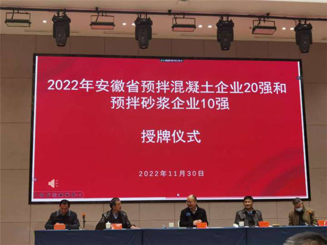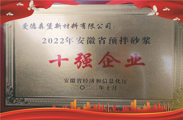2022年11月30日,安徽省經濟和信息化廳舉行了關于2022年安徽省預拌混凝土企業20強和預拌砂漿10強的授牌儀式,愛德森堡新材料有限公司市場事業部總裁陸鵬應邀參加,我司賡續榮獲“2022年安徽省預拌砂漿十強企業”。